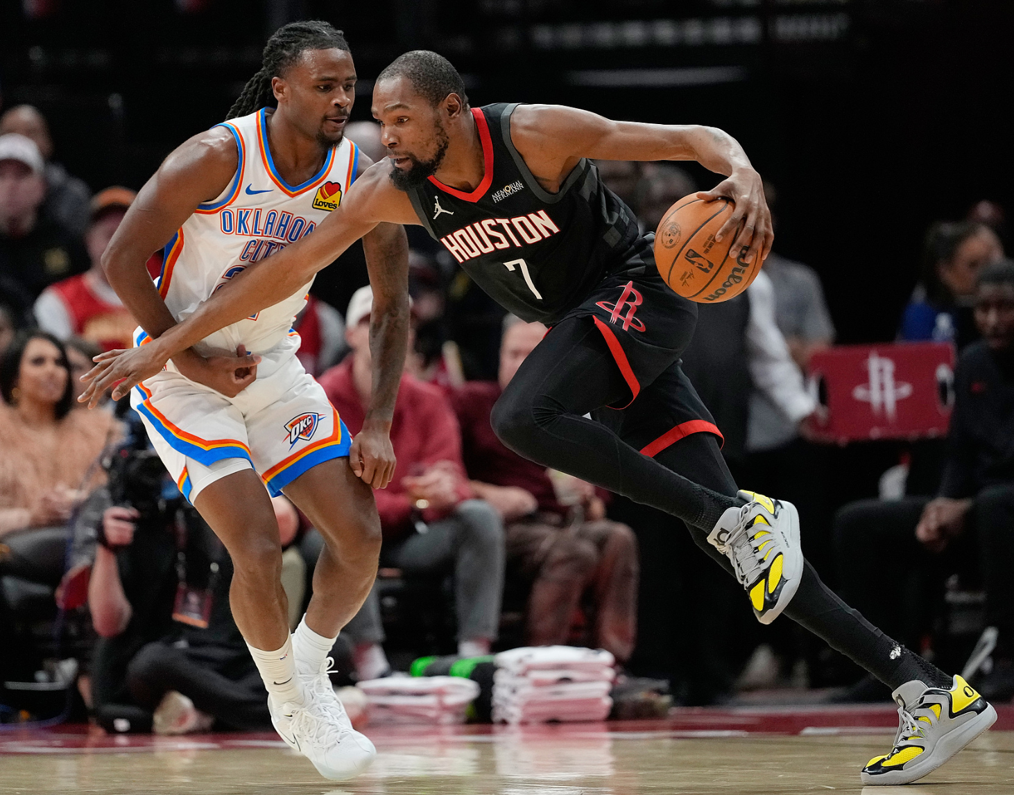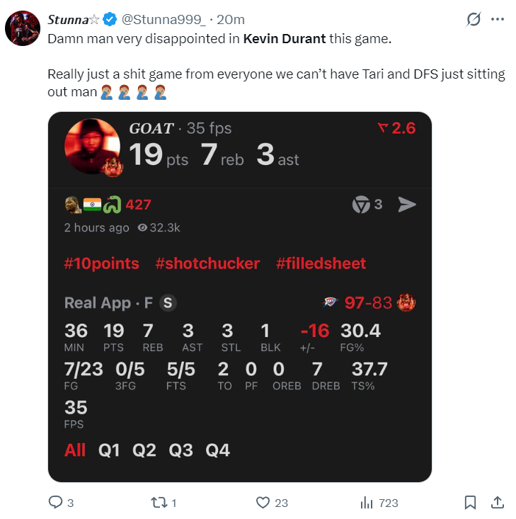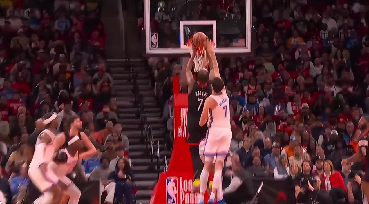末节开场雷霆一波11-4拉开分差,谢泼德在场火箭是输麻了,KD干拔一个,杜兰特三分继续打铁,末节杜兰特4中1+三分2中0,虽然是被谢泼德糟糕的防守给坑害了,可KD的手感的确不佳。