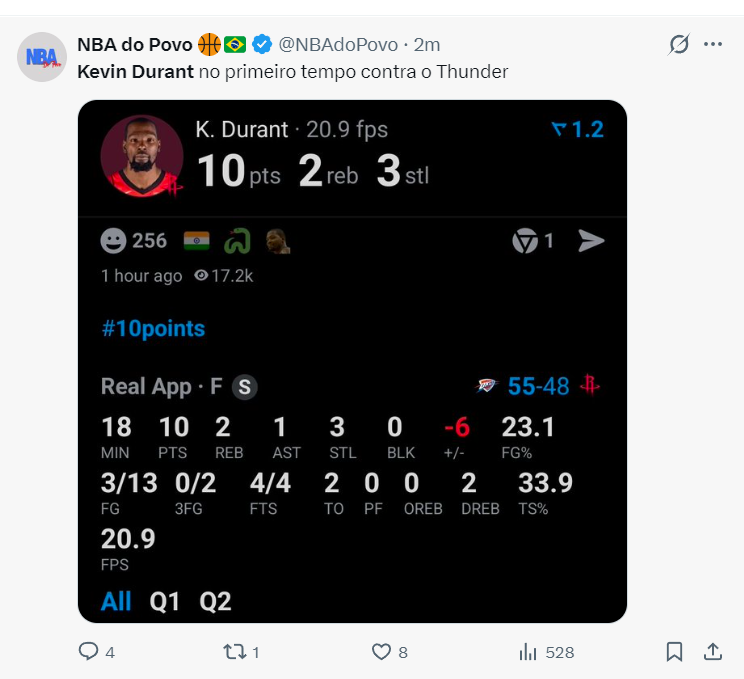 第二节杜兰特的手感依旧没开,虽然他命中两个中投(来自申京的助攻),可他单节是6中2+三分1中0,好在是雷霆早早犯满让他吃下四个罚球,单节杜兰特8分1篮板,半场杜兰特13中3+三分2中0拿到10分,命中率23.1%,这是杜兰特本赛季最差半场的效率。