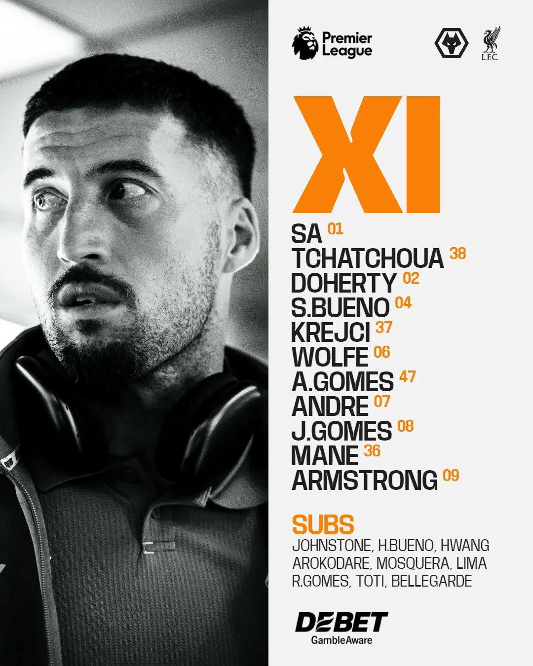 狼队首发:1-若泽·萨、2-多赫蒂、4-圣地亚哥-布埃诺、6-沃尔费、38-查丘瓦、37-克雷伊奇、47-安赫尔-戈麦斯、7-特林达德、8-若昂-戈麦斯、36-马特乌斯-马内、9-阿姆斯特朗